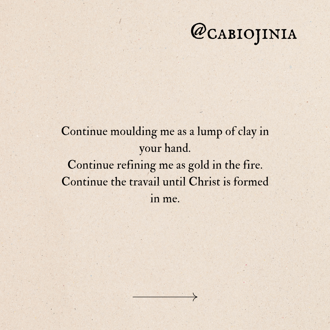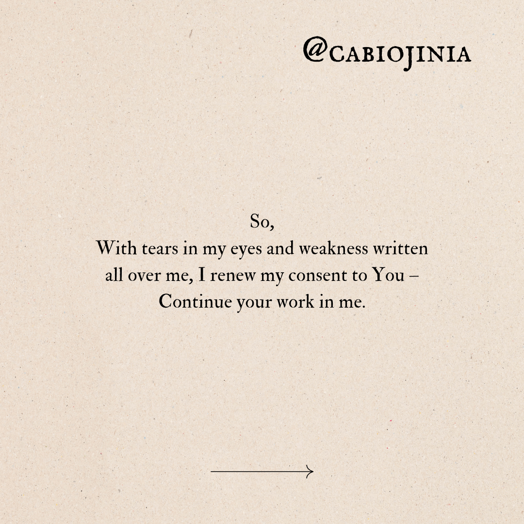 With tears in my eyes and weakness written all over me, I renew my consent to You – Continue your work in me.